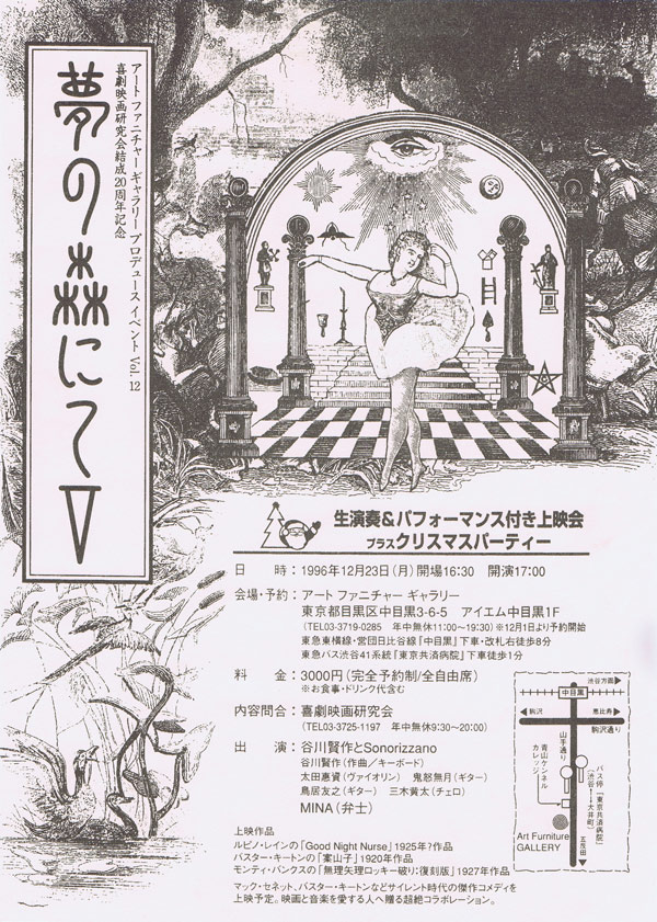 当会結成20周年(名目上)のクリスマス・イベントとして開催。会設立当初から在籍するメンバーは代表の新野を含めて誰もいないが、活動と「夢の森にて」は関東圏を中心に名画座系人口からはかなりの認知度となっていた。今回はその節目という意味から、谷川氏もコンセプトを改めて、インプロビゼーションの迫力に作曲の計算を融合させるものとなる。同年7月に滋賀県の碧水ホール「喜劇映画ルネッサンス」、9月に非公式「夢の森にて」ライヴを経験したMINAがパワーアップして登場。初参加のギタリスト鬼怒無月氏の緩急自在プレイとMINAの絶唱から、感涙にむせぶ女性客も現れた。