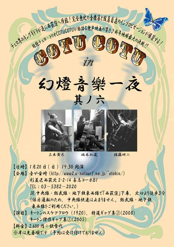 故にタイトルも『COTU COTU in 幻燈…』となって、バンド色を前面に打ち出した展開で大盛り上がり'画面伴奏ではない演奏'を謳う演奏付き上映イベントの新たな可能性を見た。
