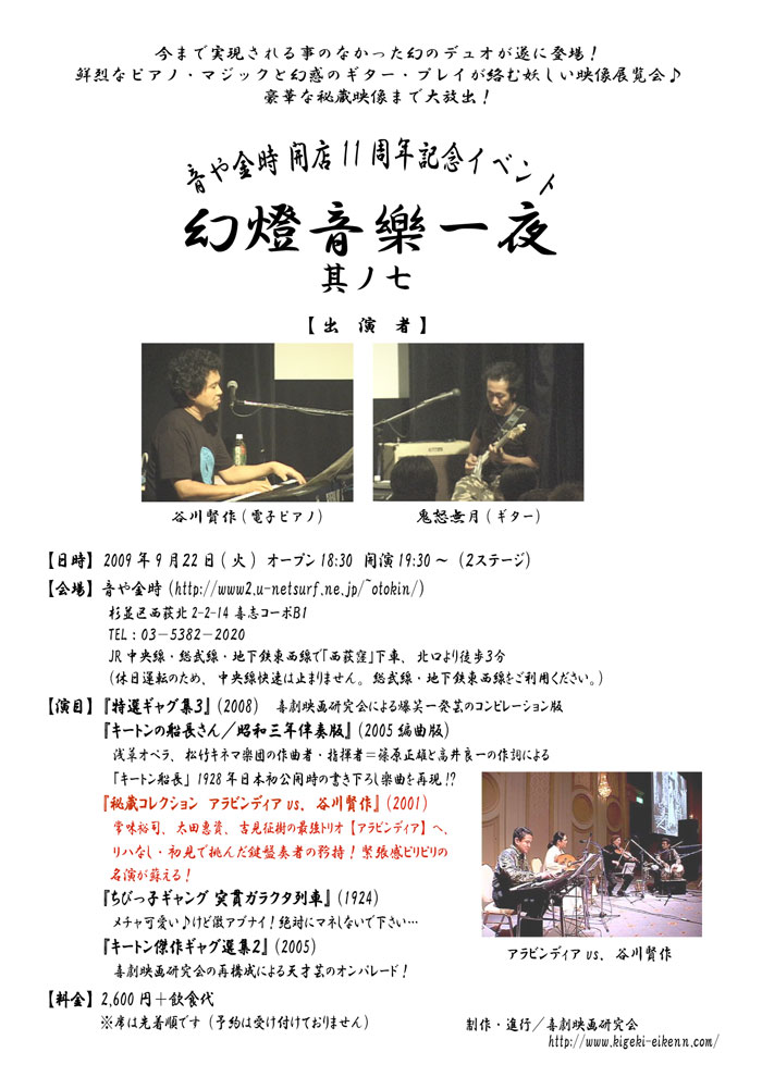 ステージ休憩中(幕間)での秘蔵ビデオ「アラビンディアvs谷川賢作」上映が予想以上に大好評!谷川・鬼怒両氏が即興で行ったアンコール演奏は初デュオとは思えない歴史的名演!と万来の拍手で終幕、「幻燈音樂一夜」シリーズはまた新たな驚異と感歎を生み出した。