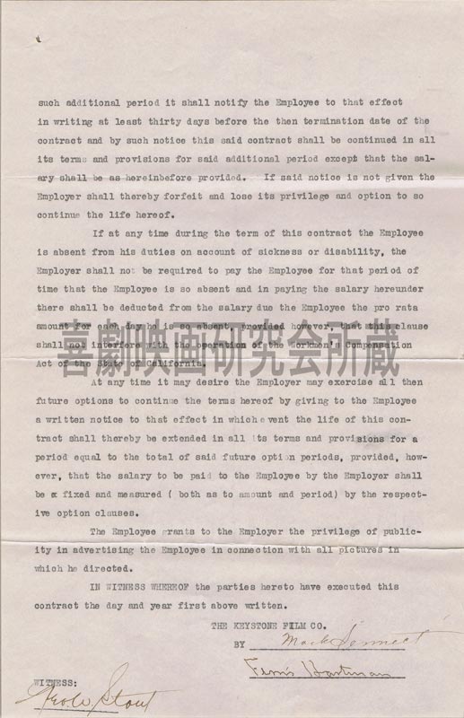 sennett_contractマック・セネットは「娯楽映画の発明者」「喜劇の帝王」と呼ばれる映画史上で最も偉大な人物のひとり。この契約書は1917年にキーストン撮影所の所長だったセネットがフェリス・ハートマンと監督契約を交わしたもの。ハートマンは19世紀末に演劇人としてデビュー、たちまち流行作家となって、1912年には自らの歌劇団(バーレスク)を率いて世界ツアーを敢行し、横浜、浅草でも上演していた国際的な劇作家。このセネットとの契約を機に、当時の大スターにして喜劇作家であるロスコー・アーバックル(バスター・キートンの師匠)や珍優ベン・ターピンの映画を監督、1920年代には娯楽映画のヒット・メーカーとなって数多くのアイドル女優なども生み出した。契約書は5枚綴りで4枚目と5枚目にそれぞれセネットとハートマン、立会人としてセネットのマネージャー、ジョージ・W・スタウトが署名しており、当時の報酬額や支払い条件を窺い知る事ができる。また、この契約書が作られた1917年は第一次世界大戦やロシア革命によりアメリカ映画が世界的人気を博すも、キーストン撮影所は経営母体の業績不振により解散となった故、色々な意味で歴史の証拠を語る貴重な資料と考えられる。個人的な感想では、セネットほど筆遣いの粗い魑魅魍魎的にメチャメチャな人もなく、この契約書のように判読可能で丁寧な筆致は特に貴重かもしれない。