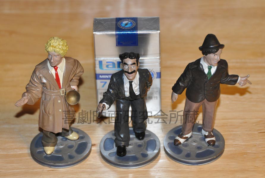 1992年よりアメリカで製造されたグルーチョ、ハーポ、チコのフィギュア。現在は絶版品。当会代表の新野敏也の友人が新婚旅行でアメリカへ行った際のお土産。新野は職場の人事異動で別の場所へ転任となった際、まだ自分のデスクも知らなかったところ、その友人(まったくの別会社)が前もってこっそり来社して新野のデスクを調べ、引き出しの中へサプライズで隠していたという(ビックリした新野はその後も友人への結婚祝いを忘れたままらしい…)いかにもマルクス喜劇のような来歴を持つ人形。