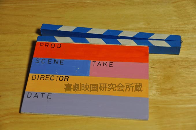バンダイ本社にある不死鳥のオブジェ、ジブリ美術館のシーラカンス型の壁掛け時計、大阪府堺の市役所のモニュメントなどで知られる立体造形作家・井村隆氏が作ったクラップ・ボード(日本ではカチンコが一般的な名称)。そのむかし井村氏は映画を製作しようとカチンコも自作したが映画は作らなかったそうで、これが当会代表の新野敏也に譲られた。井村氏の作品(カラクリンと呼ばれる)と無声映画時代の喜劇におけるガジェット感がマッチングした事から新野へ贈られたようだ。井村氏のアート「カラクリン」とは機械仕掛けの金属製オブジェで素材の地色そのままのモノトーンが特徴的であるが、この「カチンコ」は木製で実にポップな彩色仕上げ。