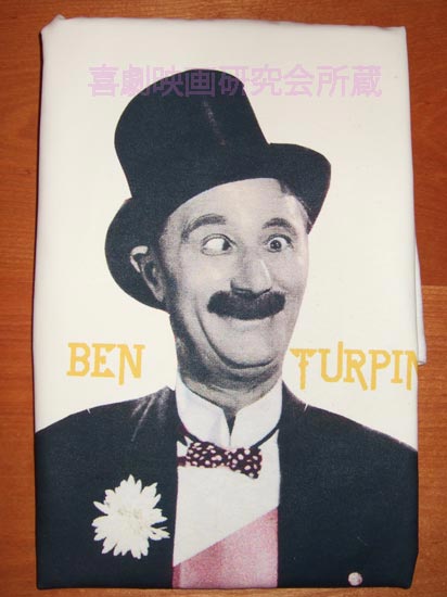 当会の初代会長ケラリーノ・サンドロヴィッチの奥様で女優の緒川たまきさんより新野敏也へ贈られた手作りTシャツ。珍優奇優がひしめく映画界の中でもそのレジェンド的存在のベン・ターピンをモチーフに選んだセンスは秀逸。ポップな感性が輝く傑作。