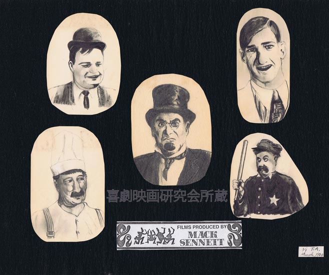 これまで紹介した所蔵品より格段に劣るかもしれない…当会代表が1980年にノートの端やメモ用紙などへ落書きしたコメディアンの似顔絵。ロスコー・アーバックル、スリム・サマーヴィル、フォード・スターリング、ハンク・マン、チェスター・コンクリンといったキーストン撮影所の主役たちをちょこまかと鉛筆で描いたもの。それらを集めて女子学生が家庭科の授業で刺繍を飾る際に使っていた額縁の余り物へ入れたらしい。幼年期に画家を志した新野は両親によって絵を含む全ての私物が廃棄されているため、これが現存する最も古い絵となり、当会本部ではわざわざ人目につくよう展示されている…。